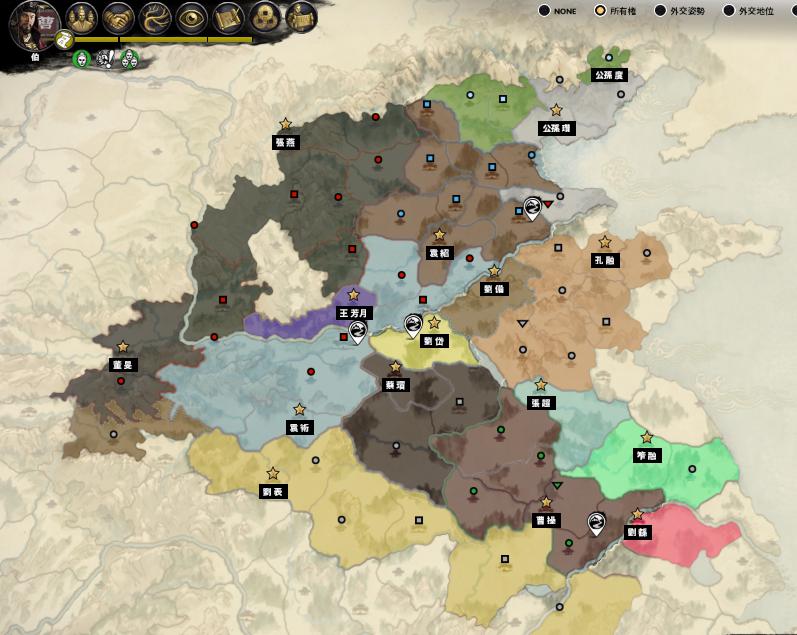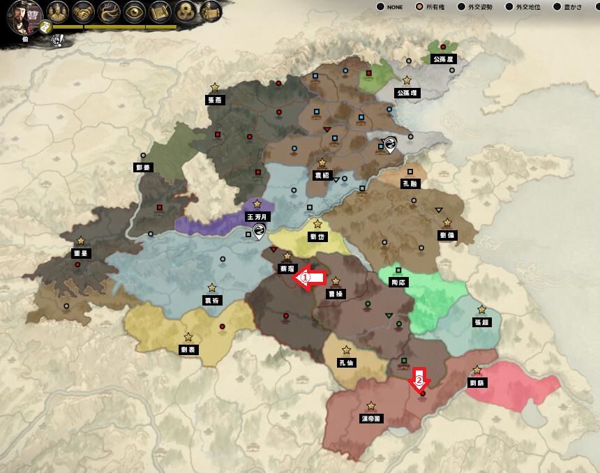 漢帝国と孔チュウから合計2拠点を奪い、蔡瑁に1拠点を奪われた状況。