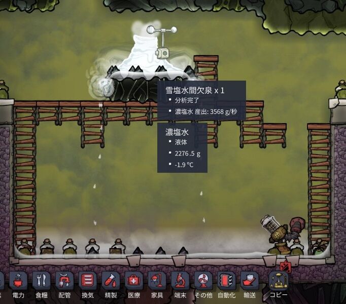 それから、間欠泉から湧いた雪塩水を、断熱パイプで冷えたままコロニーに運び……。