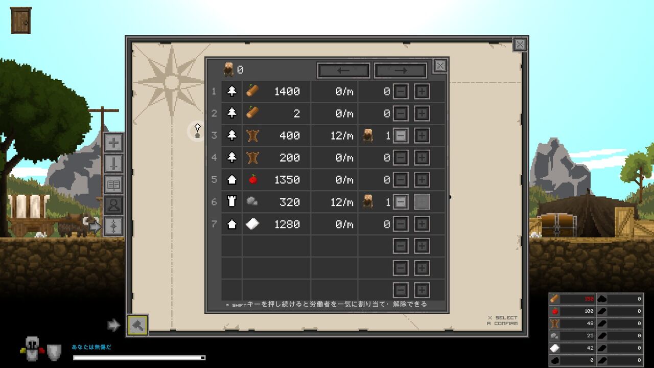 放置しててもどんどん素材が溜まっていく。とりあえず皮と石材を集めさせよう。