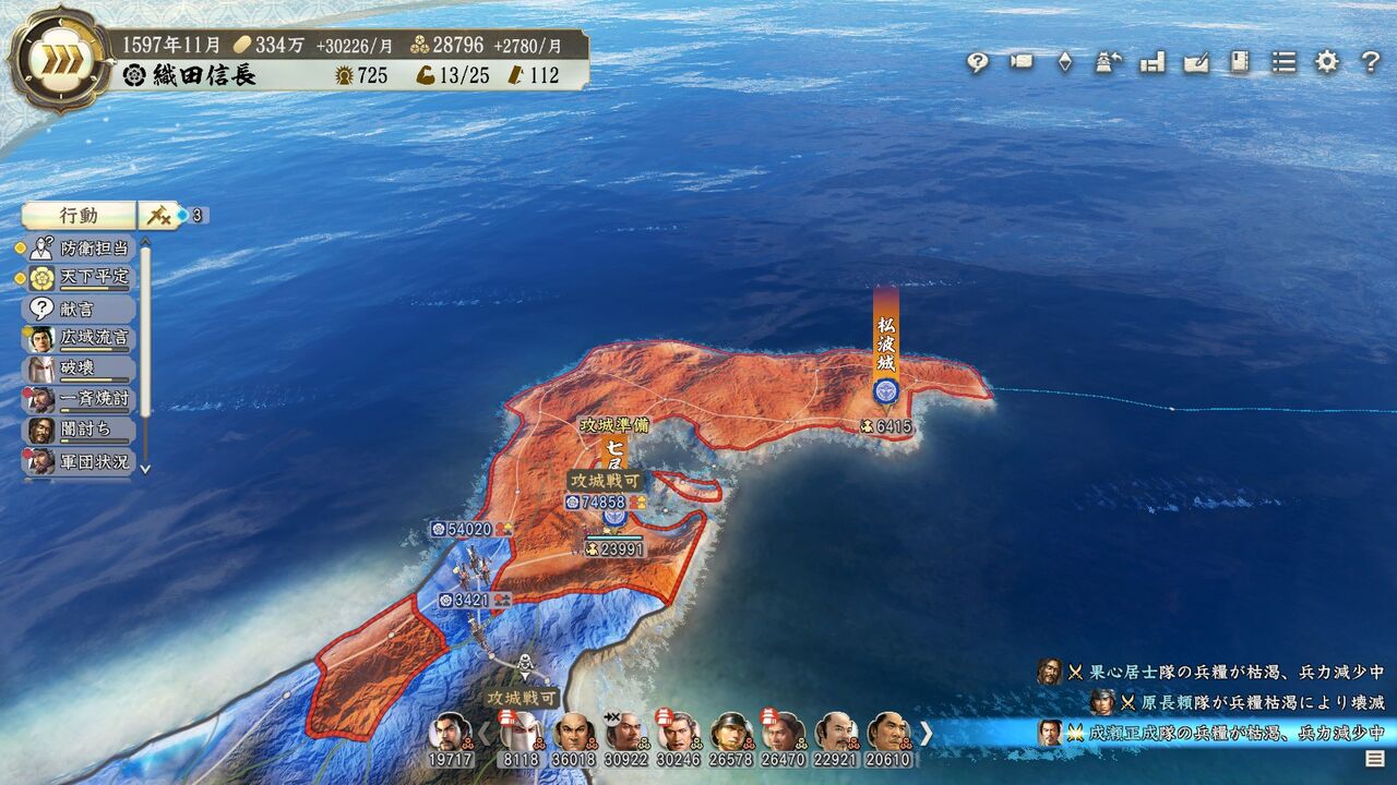 「最大兵数の50%以上が城にいる」だそうで、城主がいなかったのかな? 分からん。