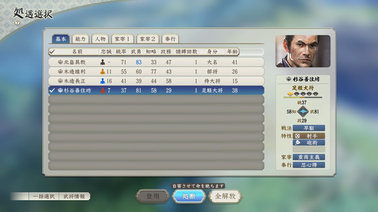 ちゃんと湯治奉行なのも良いですね。パラメータもしっかりとした猪武者である。