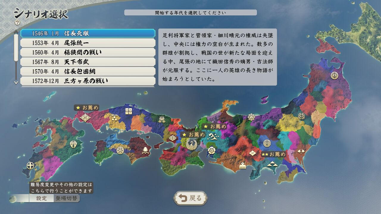 とりあえず一番時代が古い「信長元服」シナリオを選ぶ。