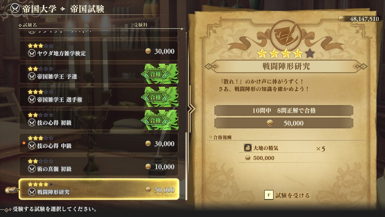 そして、冥術を取るこの周回で終わらせないといけないのが帝国試験である。