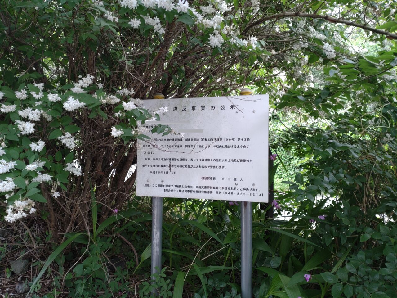 「都市計画法に違反してるから一年以内に除却しろ」という立て札があった。